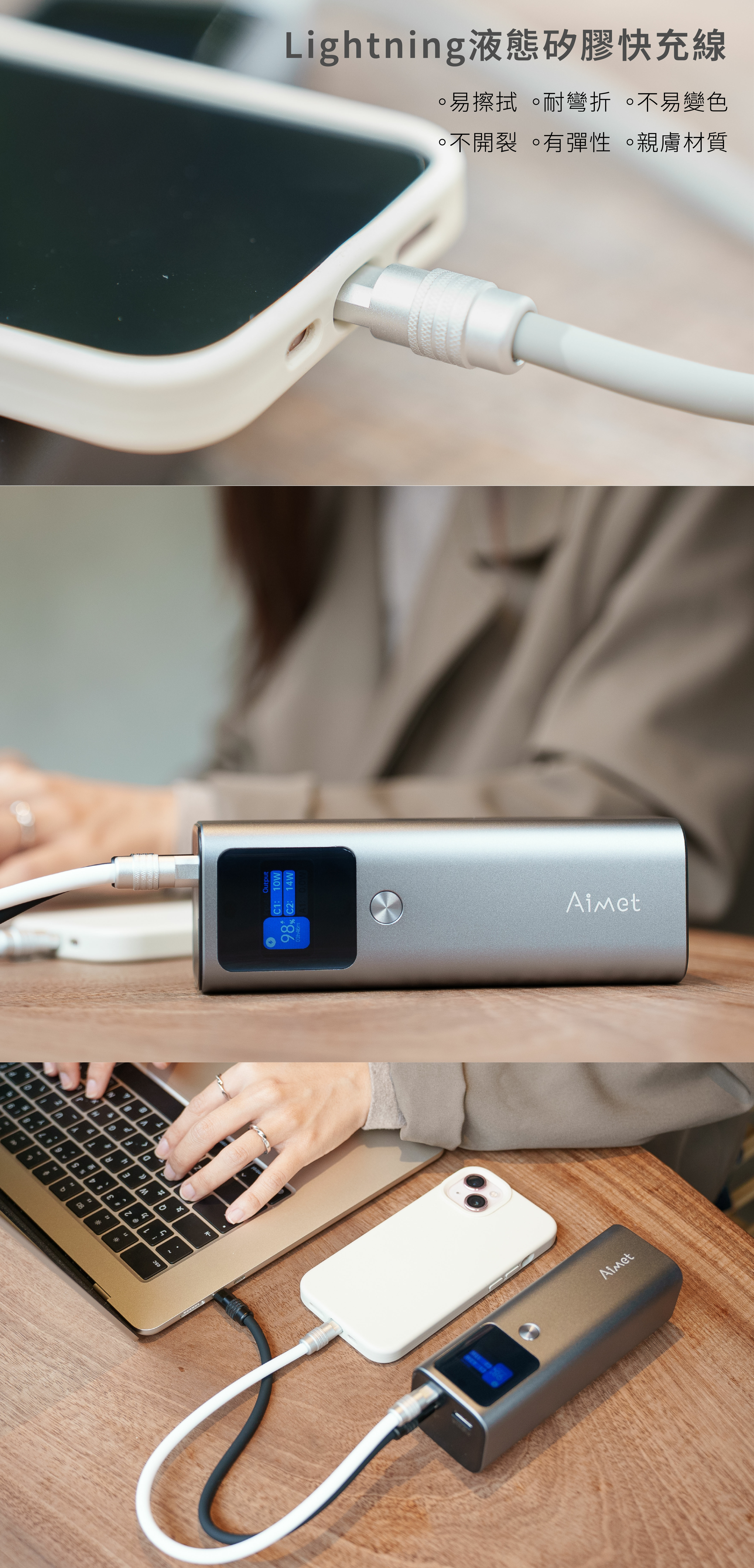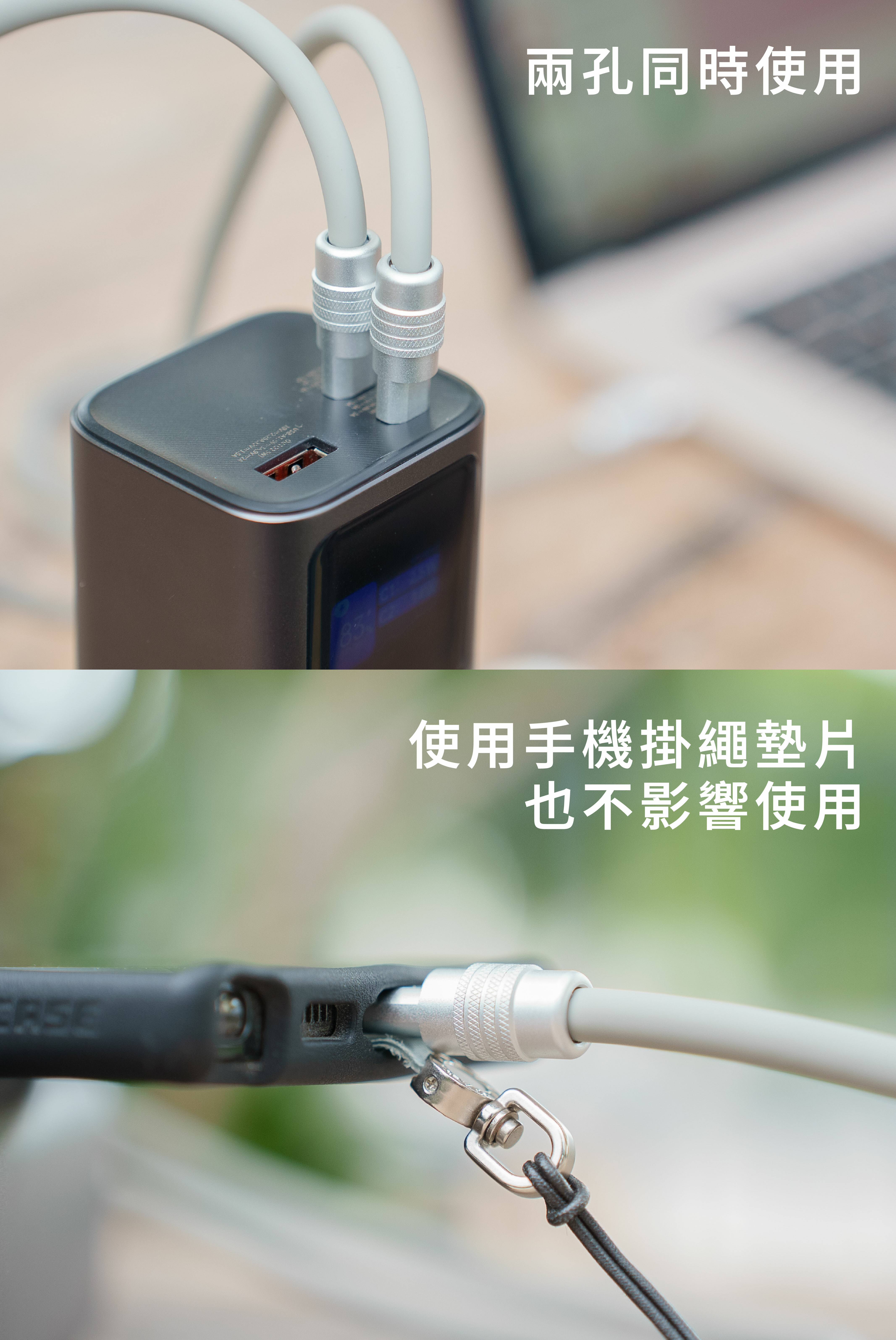 快充線材質為液態矽膠,線材表面易清潔、手感滑順柔軟。此外,接頭採用鋁合金外殼,質感耐用兼具,且特別經過倒角設計,如遇到過厚保護殼或是使用手機吊繩片也不怕卡住無法插入。